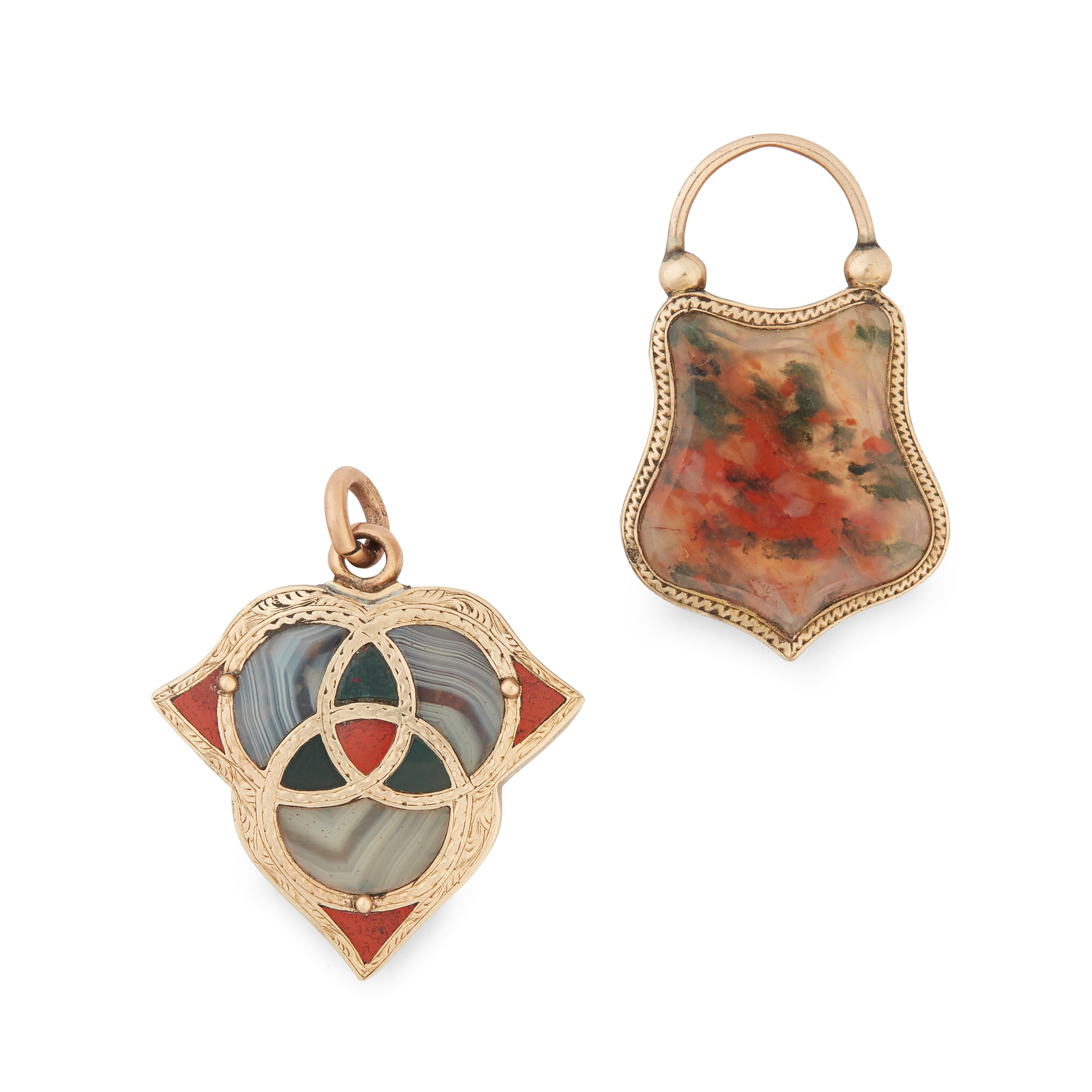 the first modelled as a padlock and set with a moss agate, glazed hair panel to reverse, unmarked; the second of scalloped outline, set with various agates, glazed panel to reverse, unmarked