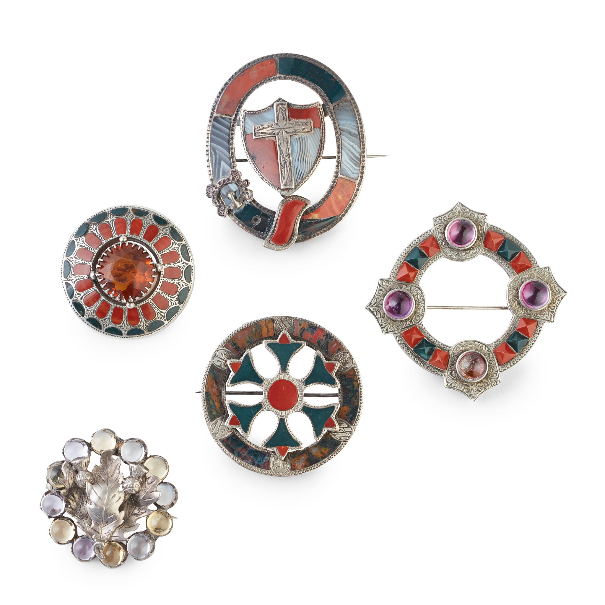 to include an agate set brooch with shield motif, another with stylised floral motif to centre; another of circular outline set with agates and paste cabochons, another set with agates and central round-cut paste; together with a circular brooch with thistle motif in a border of citrine, moonstone and amethyst cabochons