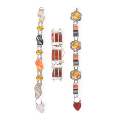 two examples with alternating polished hardstones and silver mounted faceted vitrines; together with an agate and silver mounted bracelet formed of reeded rectangular panels