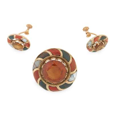 earrings marked 9ct, of circular outline with border of agate and hard stones and claw set to the centre with a faceted citrine