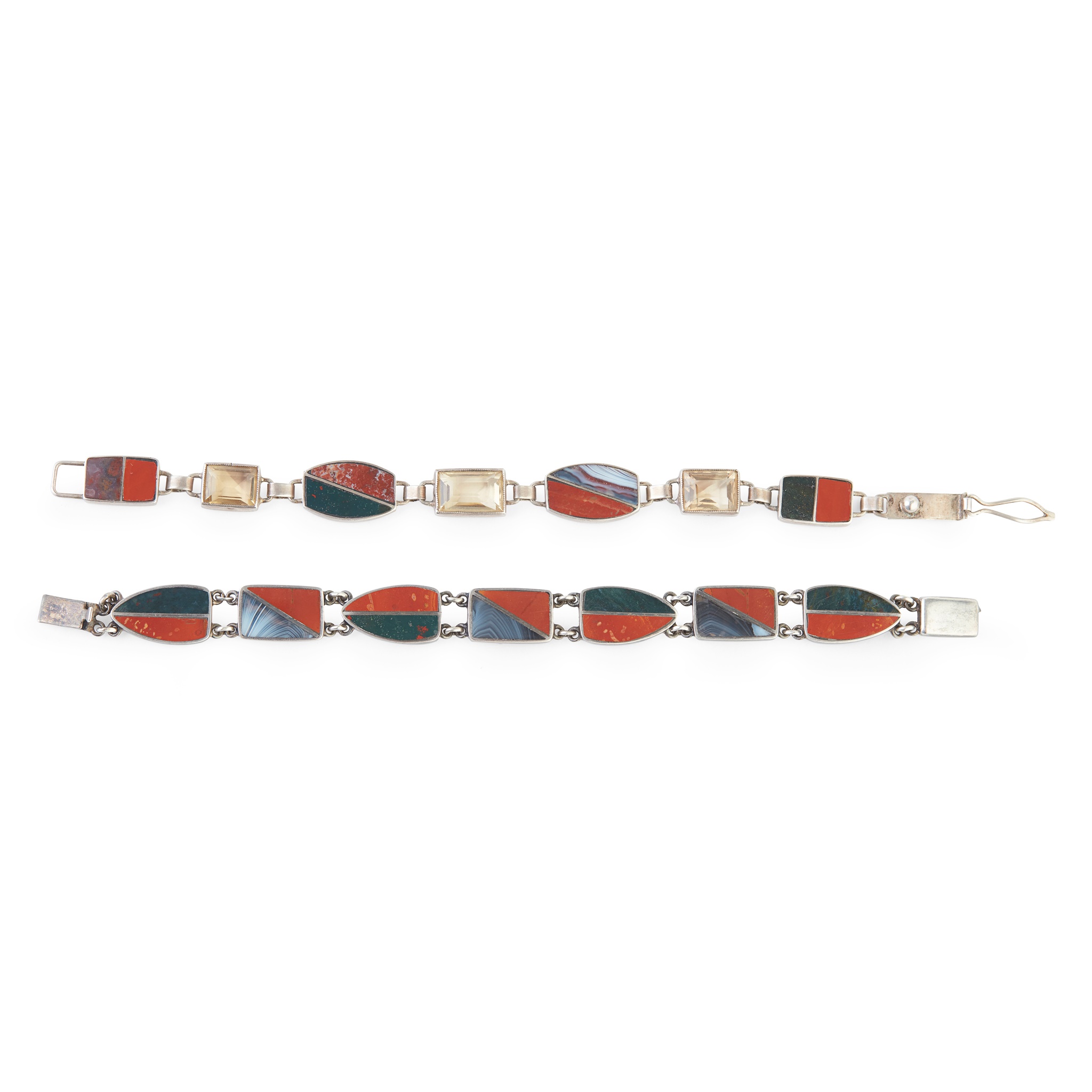 Joseph Cook & Son, composed of alternating links of millegrain set facetted ctirines, to box clasp; together with another Joseph Cook & Son, the rectangular and shield alternating links each set with various agate, to box clasp