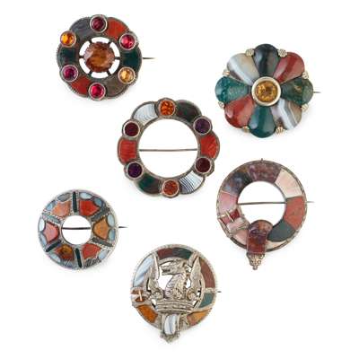 to include a circular agate set brooch with applied crest; another modelled as a belt with buckle, a circular brooch with applied agates modelled as shields; together with three various brooches, each of moulded circular outline, set with various agates and paste