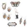 comprising a pair of earrings and brooch, each modelled as a shield, claw set with an oval citrine in a pierced border set with agates; together with an agate set brooch modelled as a butterfly; an agate set brooch modelled as a harp, another brooch and a padlock with foliate detail engraved to reverse; together with a pair of agate set pendant earrings