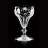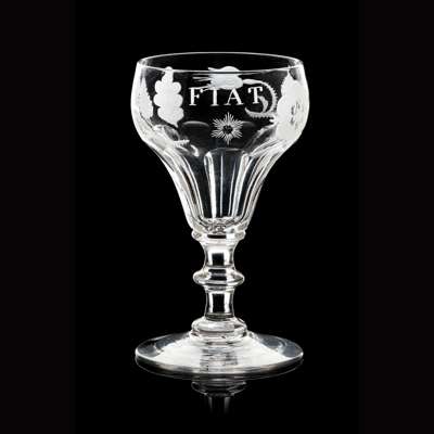 the deeply tapered bowl with facetted lower section, the upper rim finely engraved with rose head and closed bud, oak leaf, open rose bud, star and FIAT, raised on a knopped stem and plain circular foot