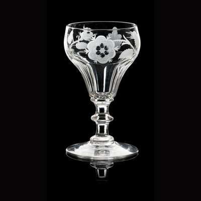 Note: This syllabub glass is a highly unusual form of Jacobite drinking glass. While firing glasses and wine glasses etc. are commonly recorded the number of syllabub glasses number very few.