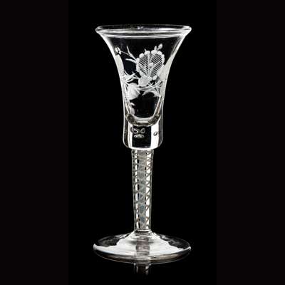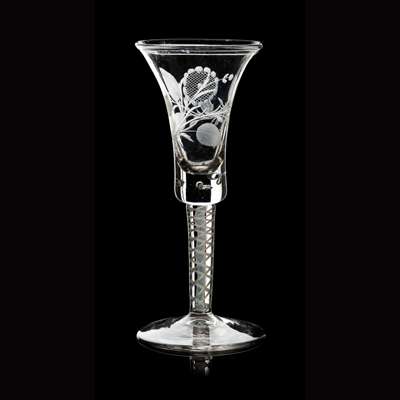 the flared bowl engraved with rose head with foliate and forget-me-not flowers, raised on a multi enamel twist stem and spreading foot