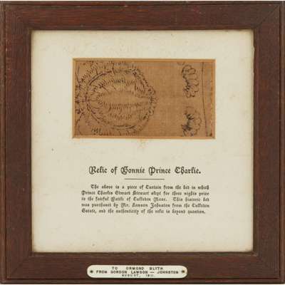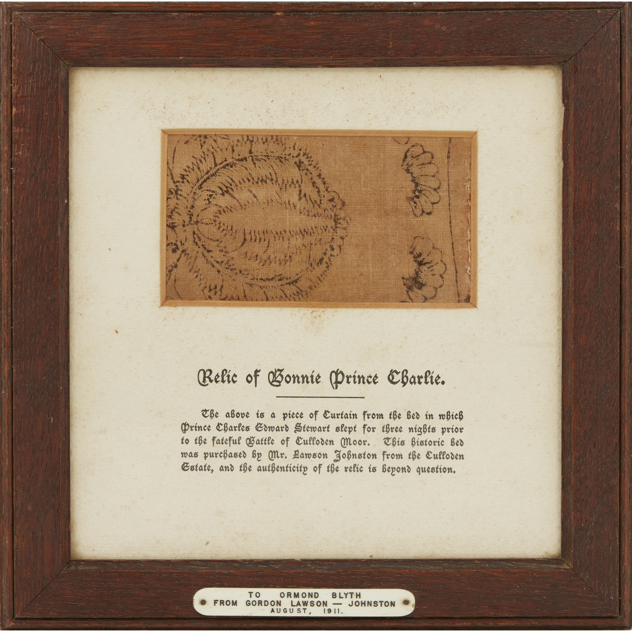 the decorated fragment with foliate detail, within card mount with inscription reading ‘Relic of Bonnie Prince Charlie. The above piece of Curtain from the bed in which Prince Charles Edward Stuart slept for three nights prior to the fateful Battle of Culloden Moor. This historic bed was purchased by Mr. Lawson Johnstone from the Culloden Estate and the authenticity of the relic is beyond question’, within a simple oak frame with applied ivorine plaque inscribed ‘To Ormond Blyth from Gordon Lawson-Johnston, August 1911’