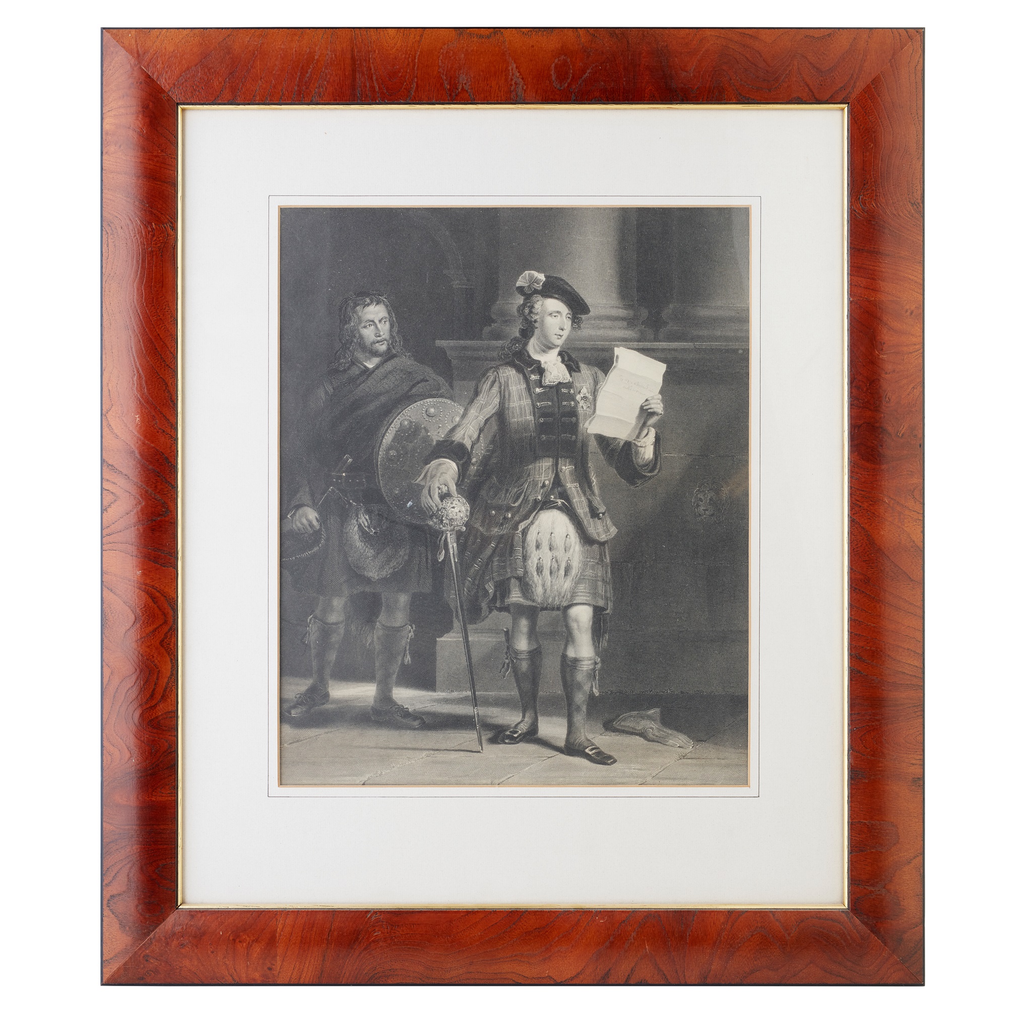 showing Prince Charles Edward Stuart reading dispatches in full Highland Dress with blue bonnet and silver sword, his highland attendant behind him, architectural setting, in modern frame and mount