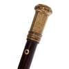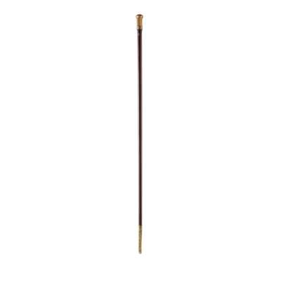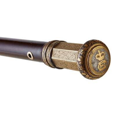 unmarked, the gold inlaid steel head with compressed gold inlaid pommel, with British crown surmounting initials ‘CE’ within arched and foliate borders, the lower panelled section of the head formed of finely inlaid foliate scrolls with inlaid ribbed and plain collars below, the tapered snake wood stick with inlaid gold eyelet and later brass ferule to point