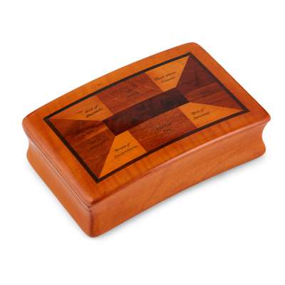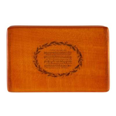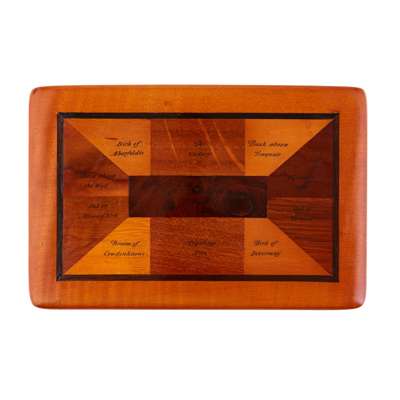 of rectangular form, the hinged lid inlaid with specimen woods, bearing inscriptions THE VICTORY/ BUSH ABOON TRAQUAIR/ ELDERSLIE YEW/ OAK OF TORWOOD/ BIRK OF INVERMAE/ TRYSTING TREE/ BROOM OF COWDENKNOWES/ OAK OF ALLOWAY KIRK/ THORN ABOON THE WELL/ BIRK OF ABERFELDIE/ QUEEN MARY'S YEW, and bearing transfer print of Auld Lang Syne to the base, stamped maker's mark under lid D. CRAIG, HELENSBURGH