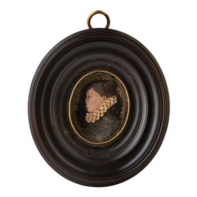 the sitter attributed as Mary Queen of Scots, the profile bust in varied coloured wax with deep relief, in oval brass mount and turned ebony frame; together with manuscript label (loose)