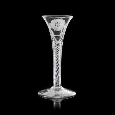 The drawn trumpet bowl engraved with open rose head, buds and oak leaf, raised on a multi series air twist stem and slightly domed circular foot
