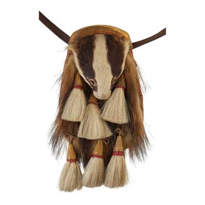 the full badger mask sporran with six tassels with gilt bells, the arched brass cantle to red leather backing; together with a white seal fur dress sporran with silver plated cantles