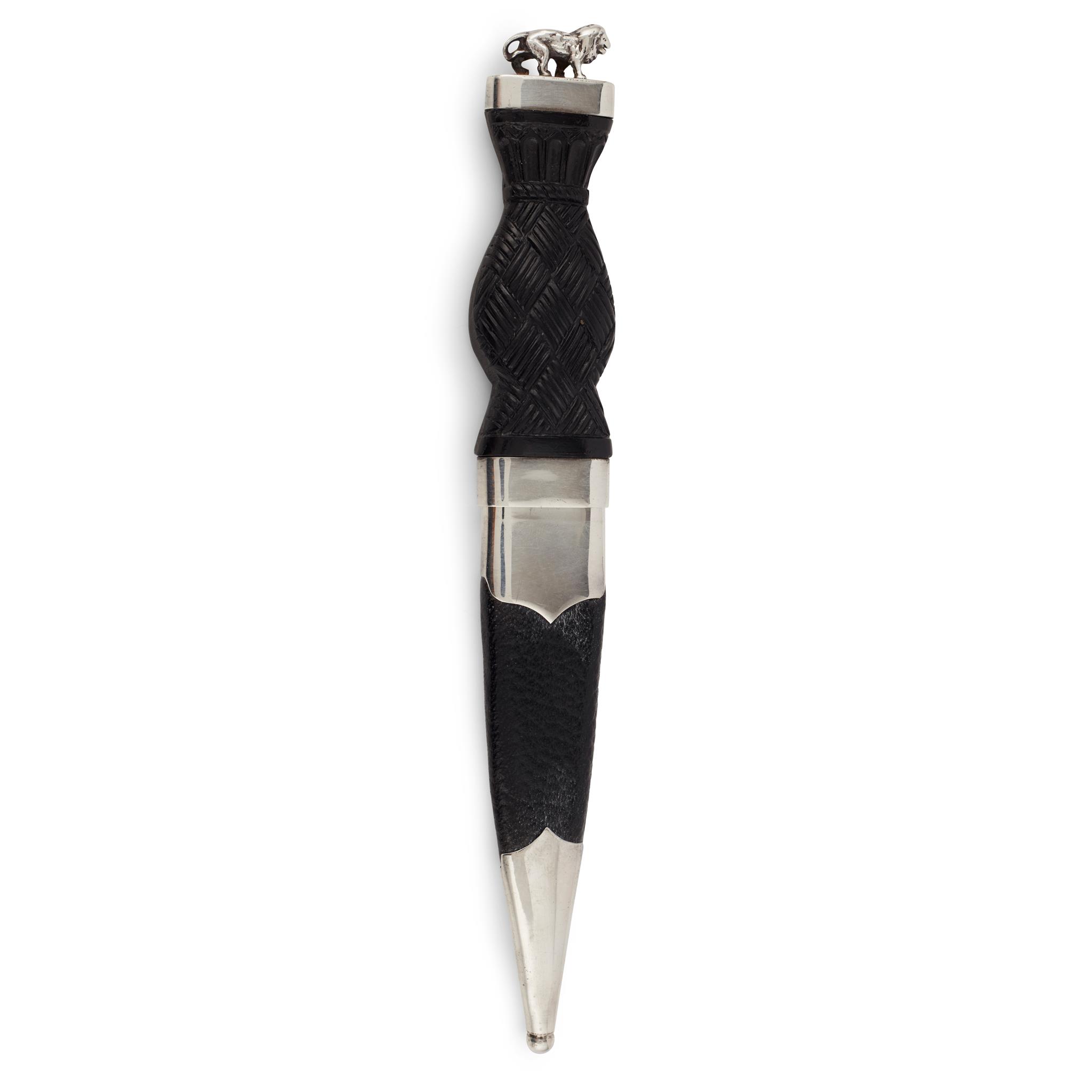with part Edinburgh hallmarks, the basket weave handle with cast figure of a lion to pommel, stainless steel blade with scalloped back edge, in a leather covered scabbard with simple plain mounts