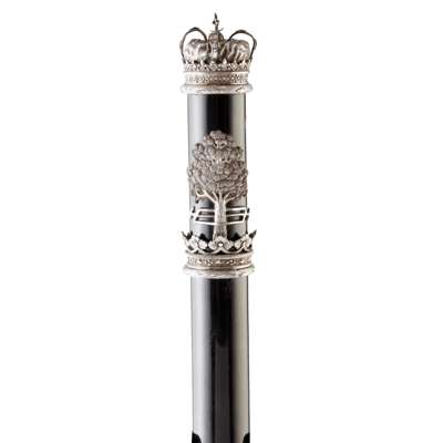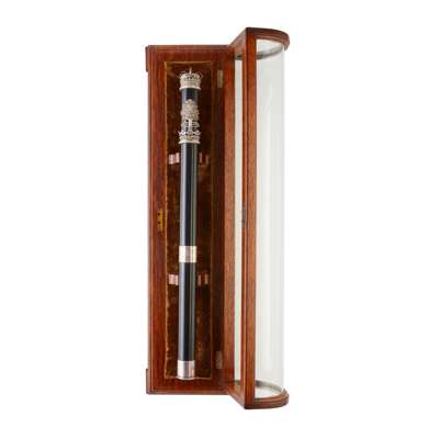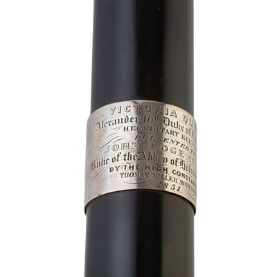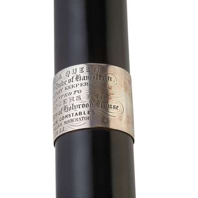 unmarked, the ebony cylindrical shaft set with royal crown to top and simple collar to base, the upper section with applied lion rampant above a Ducal coronet, the reverse with oak tree with saw through trunk (for Hamilton), the central section with applied presentation band engraved Victoria Queen, Alexander 10th Duke of Hamilton Hereditary Keeper, Presented to John Rogers Esquire, Baillie of the Abbey of Holyrood House, by the High Constables, Thomas Miller Moderator 1851’, in fitted velvet lined glazed domed oak display case