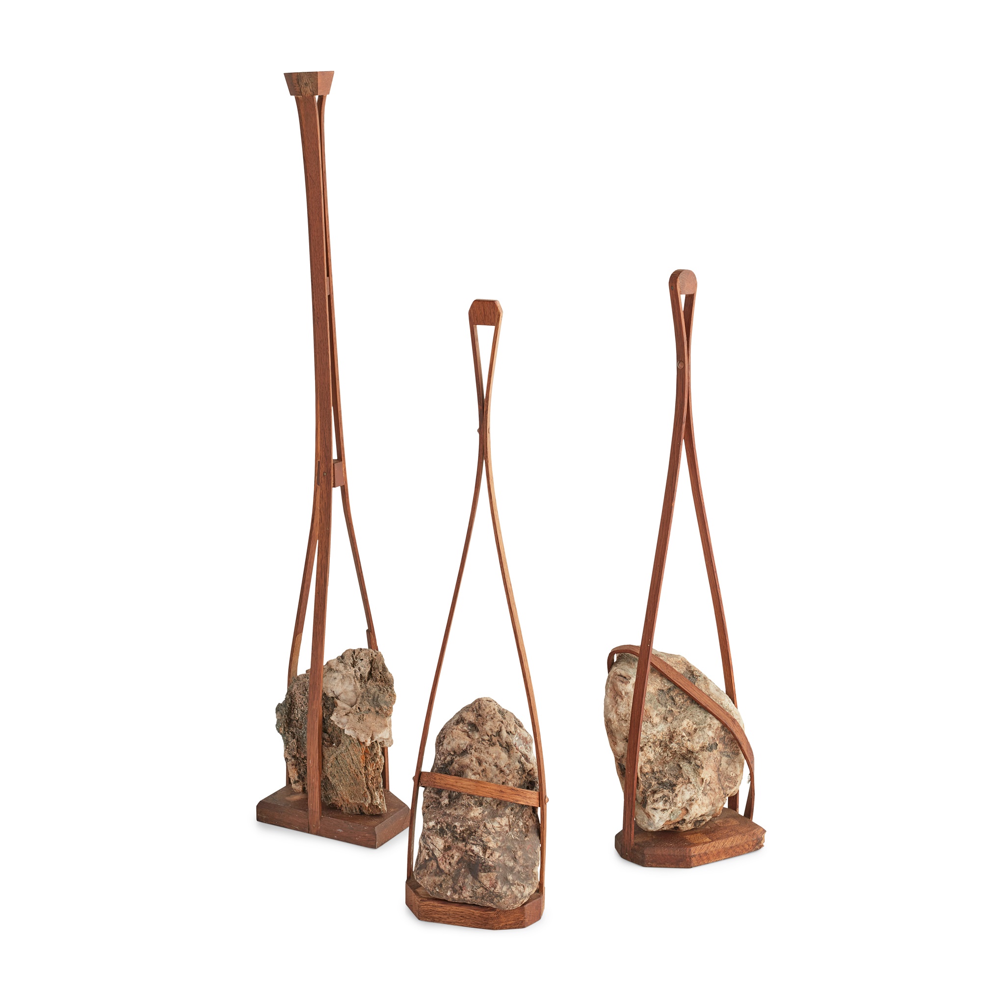each with quartz boulders enclosed within oak strapwork frames on plinths, 75cm high; 57cm high and 56cm high