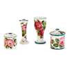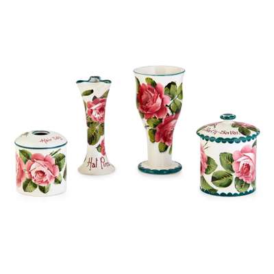 bearing inscription BATH SALTS, painted and impressed maker's marks WEMYSS, printed retailer's T. GOODE & CO., 12cm high; a HAIR TIDY, Cabbage Roses pattern, bearing inscription HAIR TIDY, painted and impressed maker's marks WEMYSS, 9cm high; a MAY VASE, Cabbage Roses pattern, decorated by Edwin Sandland, painted maker's mark WEMYSS, 16.5cm high; and a HAT PIN HOLDER, Cabbage Roses pattern, decorated by Edwin Sandland, painted maker's mark WEMYSS, 15.5cm high