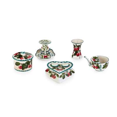comprising a LOW KINTORE CANDLESTICK, impressed maker's mark WEMYSS WARE, 11.5cm high; a SMALL BEAKER VASE, decorated by Edwin Sandland, painted maker's mark WEMYSS and T. GOODE & CO retailer's mark, 11.5cm high; an INVALID CUP, impressed maker's mark WEMYSS, printed retailer's mark T. GOODE & CO., 15.5cm across; a BISCUIT BARREL & COVER, painted and impressed maker's marks WEMYSS, printed retailer's mark T. GOODE & CO., 11cm high; and a HEART-SHAPED INKSTAND, impressed maker's marks WEMYSS WARE/ R. H.& S., 18cm across