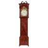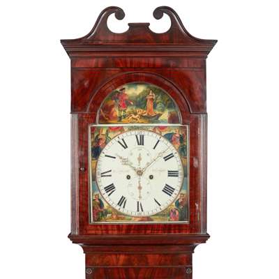 with swan neck pediment over arched painted dial with figural panel and spandrels, depicting 'Liberty, Justice, Peace, Plenty', flanked by fluted pilasters, subsidiary seconds and calendar dials, over crossbanded trunk door, fluted pilasters, on base with bracket feet, the eight day movement striking on a single bell