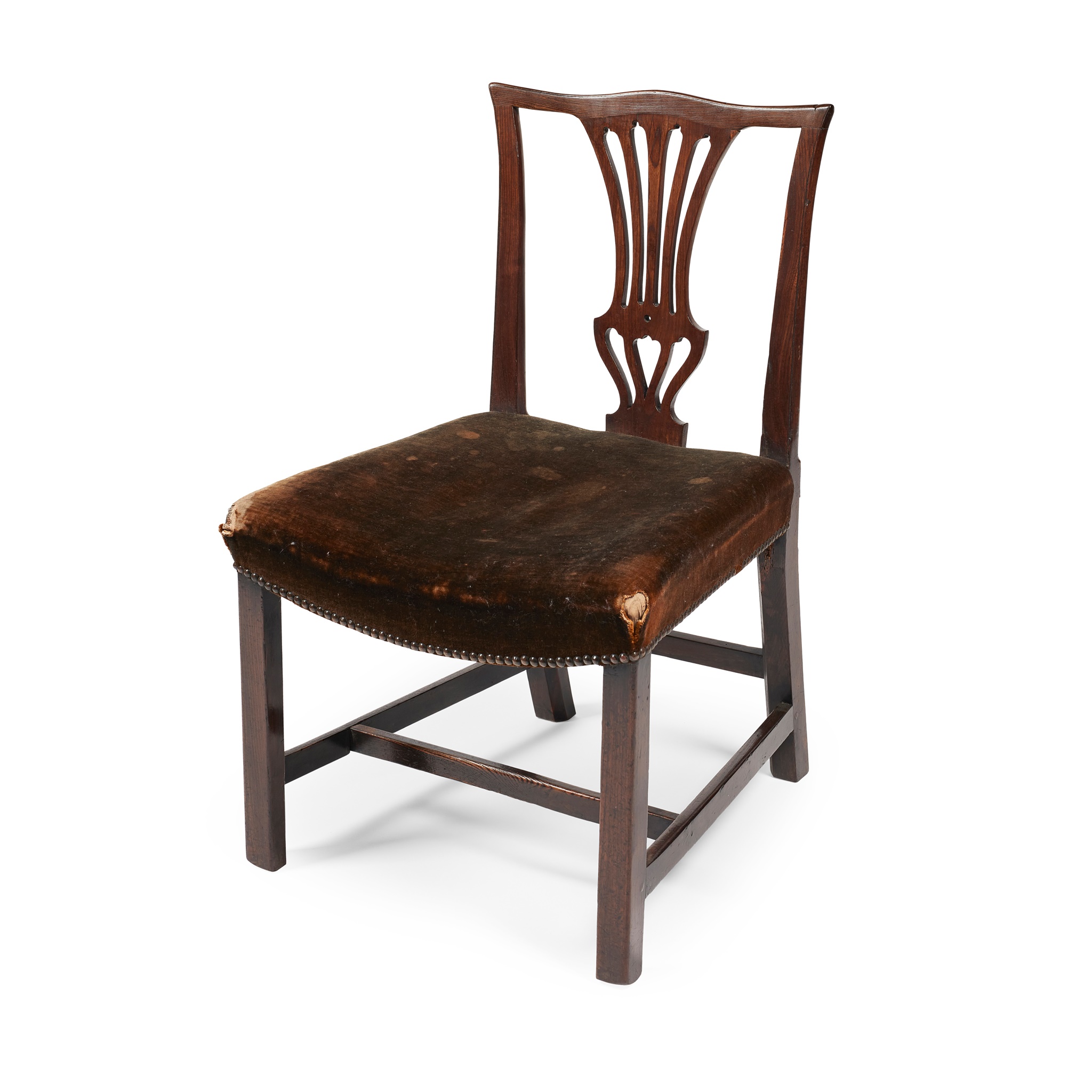 the pierced splat above dished velvet seat, on square chamfered legs, linked by H-stretchers