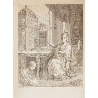 2 vol., titles and text in English and French, engraved frontispiece and 58 plates, titles in red and black, occasional spotting, contemporary speckled calf, gilt, vol.1 upper cover detached, both vol. joints splitting, corners worn, chipped, rubbed, 4to, for J. Tassie, 1791.