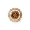 the scalloped circular frame with engraved foliate scrolls on matted back ground, centrally set within a raised claw setting with a round cut 'Cairngorm', the reverse inscribed ‘KILDONAN 1869’, hinged pin and safety catch