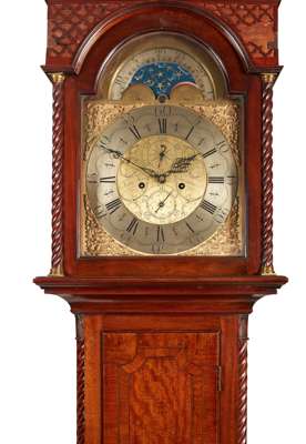 the arched engraved brass dial with silvered chapter ring and subsidiary date, seconds and moon phase dials to the arch, engraved JOHN HAMILTON GLASGOW, enclosed within mahogany case with blind fretwork decoration