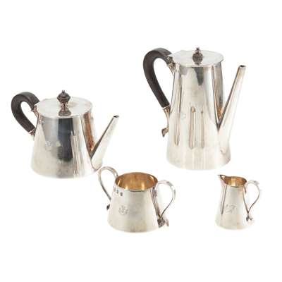 marked WR, BLTR, the lids with additional ROBB / BALLATER triangular mark, comprising coffee pot, Edinburgh 1912, remaining items Edinburgh 1911, teapot, twin handled sugar bowl and milk jug, each of simple flared form with straight spouts and curled handles with heart shaped terminals, the bodies engraved with crest and motto to one side and italic initials to other, each additionally engraved ‘Ballater 1917’