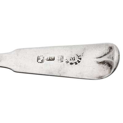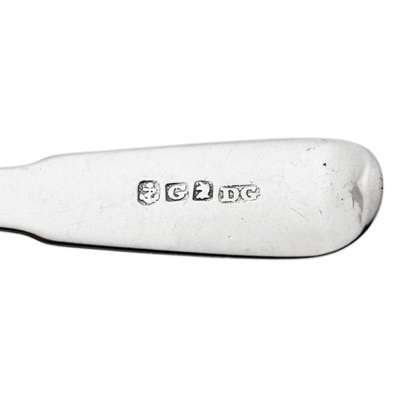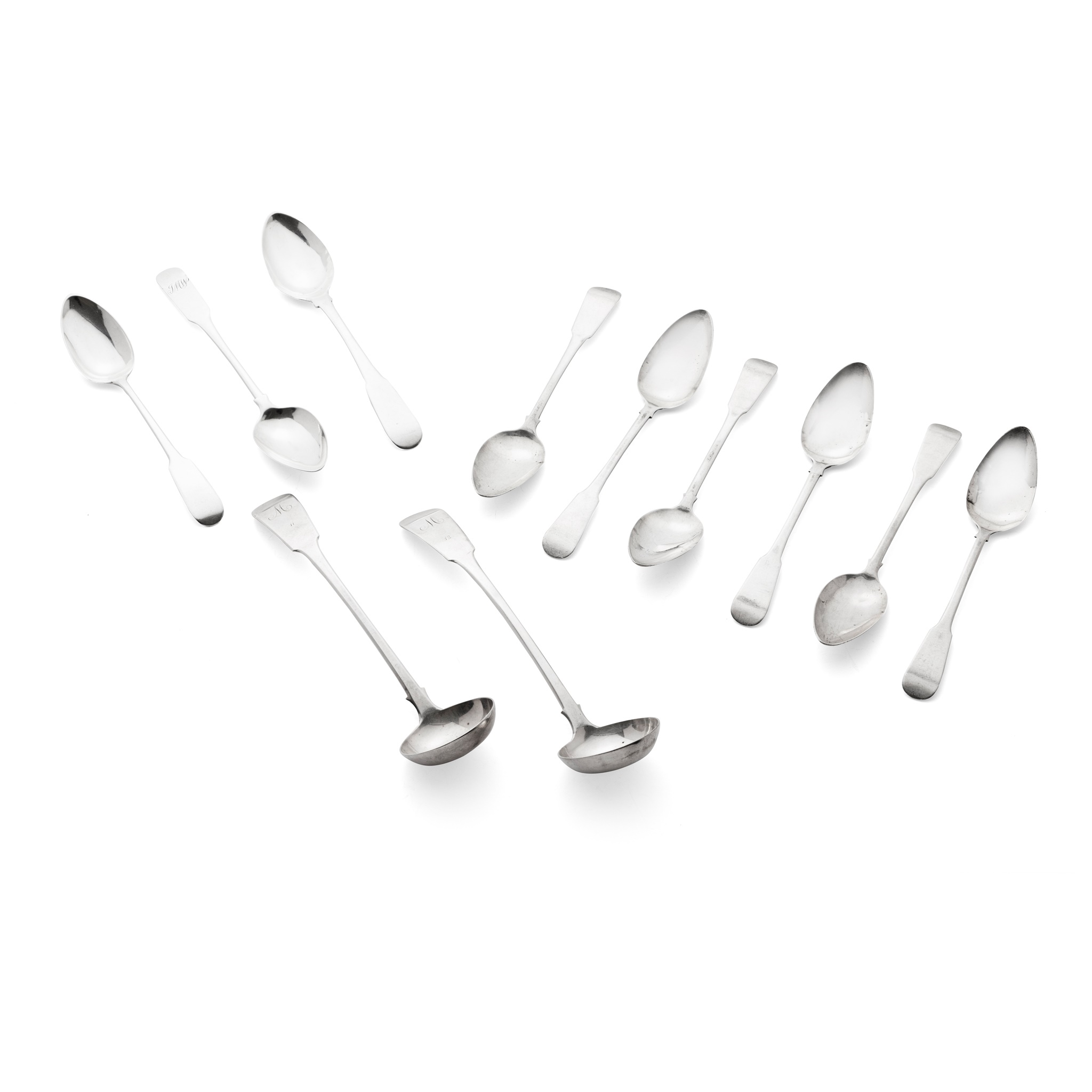 marked B, ruined castle, D, anchor, of Fiddle pattern with script initial M to terminal; together with pair of teaspoons, David Gray; a set of six teaspoons, M Hinchscliffe and a Greenock teaspoon by T Davie