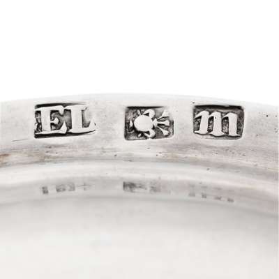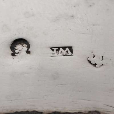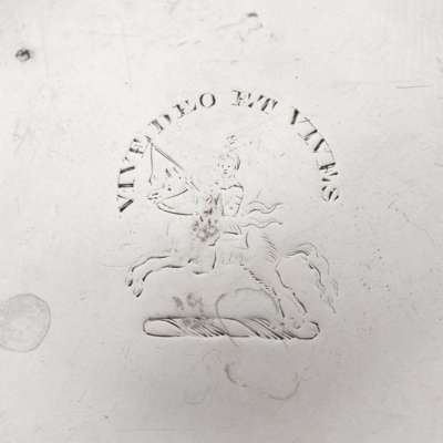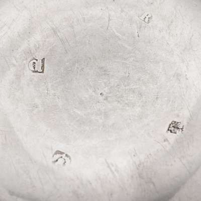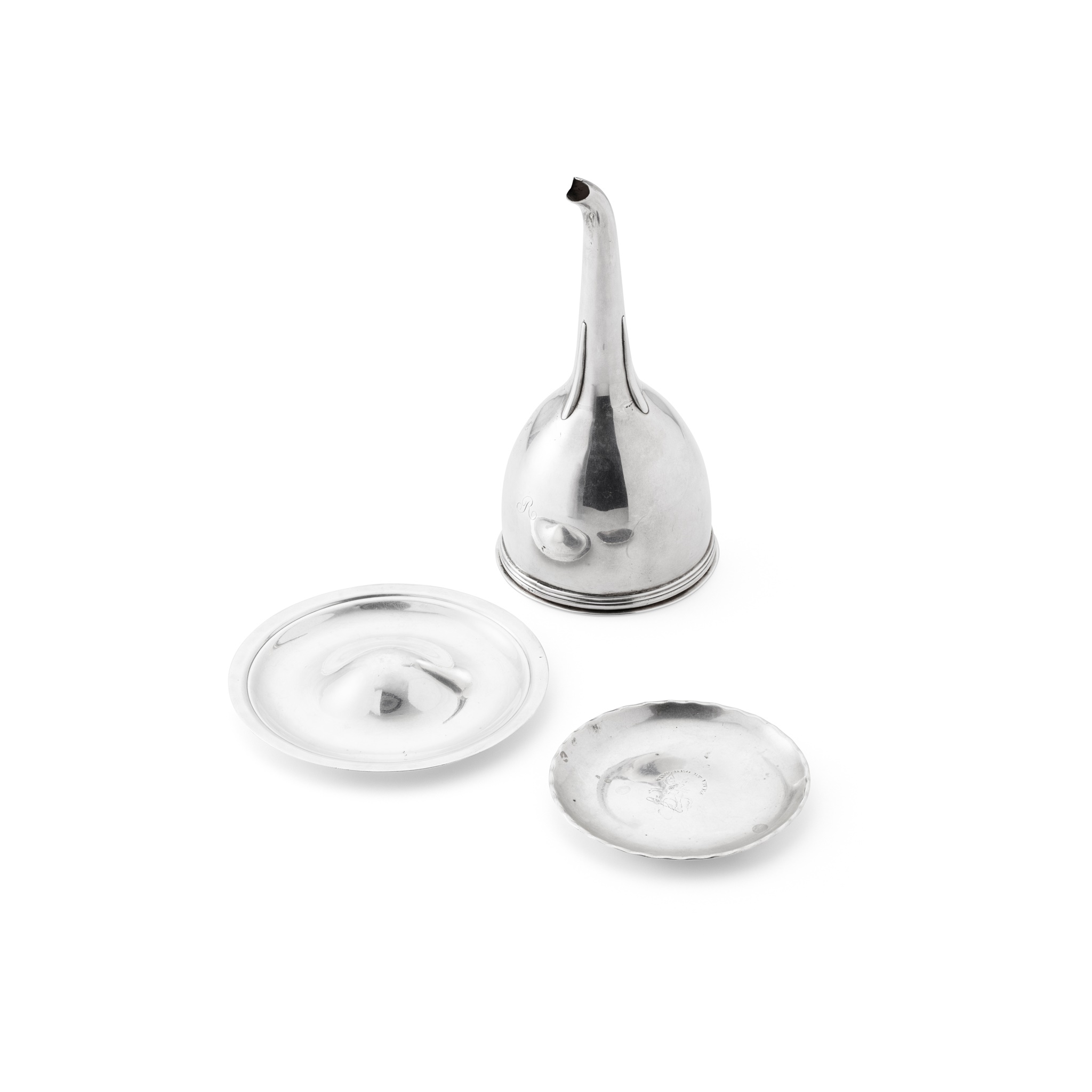 marked EL, pot of lilies, M, of circular dished form with raised centre; together with a George III wine funnel, William Robertson Edinburgh c1800 (date letter lacking) of traditional form with muslin ring and curved spout; a small funnel, flat with wavy edge and engraved crest, Patrick Robertson, Edinburgh 1769