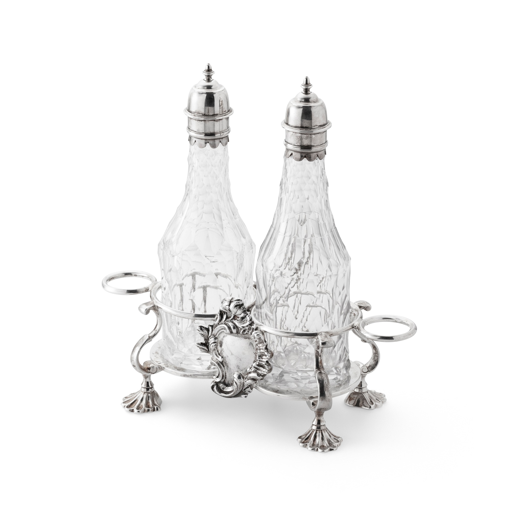 marked AG, Glasgow town mark, the twin cut glass bottle with simple scalloped mounts and pull off covers, sitting in a wire work frame with reeded S scroll handle and cast cartouche
