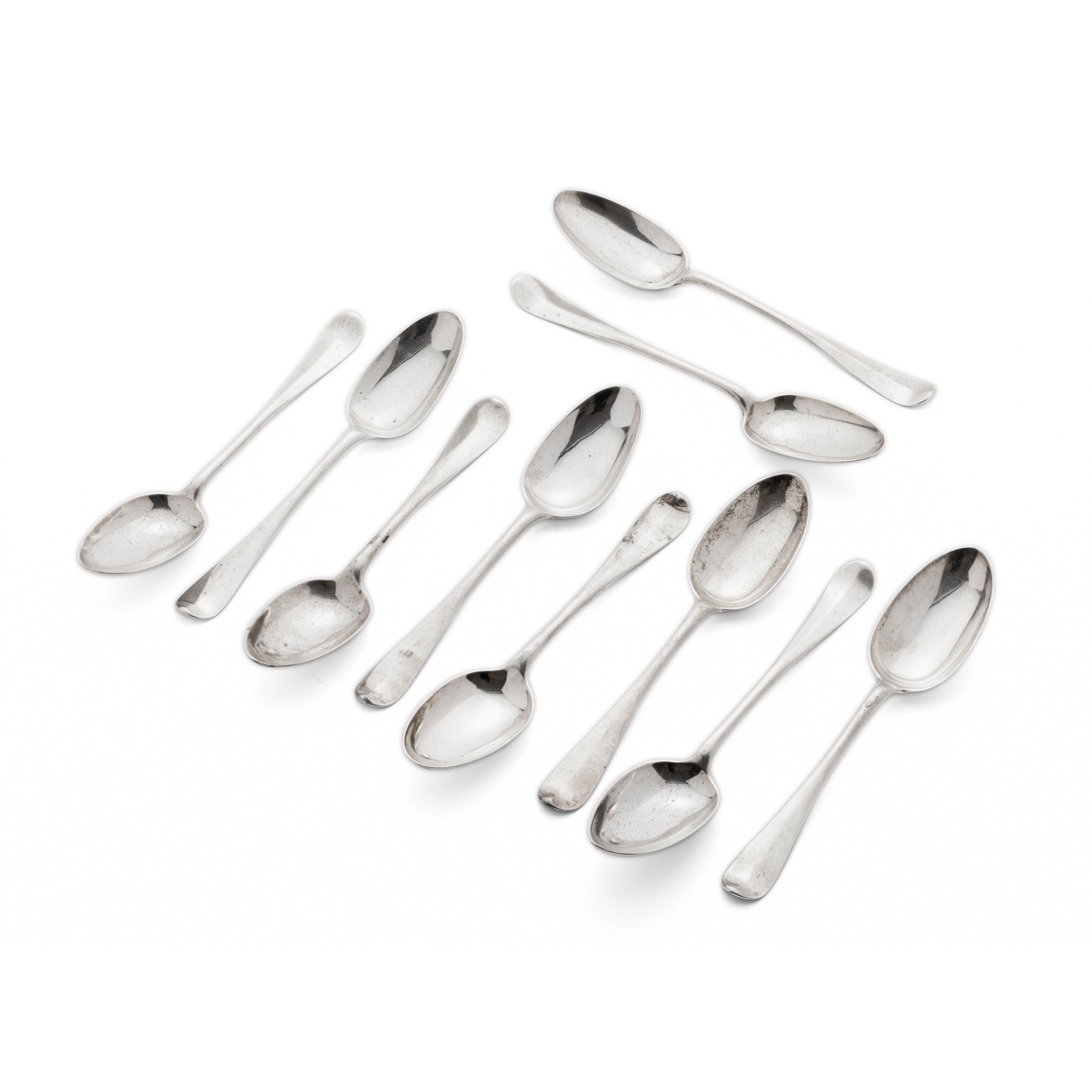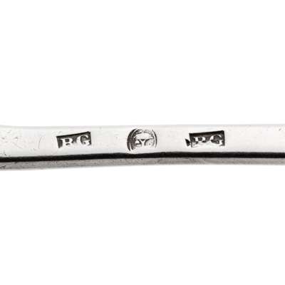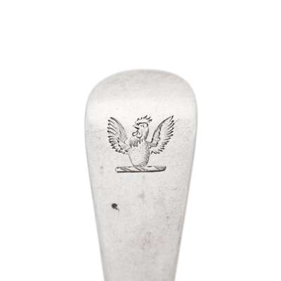 marked RG, town mark, RG, of Hanoverian pattern with foliate and script initials to terminal; together with a set of six George III tablespoons by Patrick Robertson, Edinburgh 1758, of Hanoverian pattern with crest to terminal