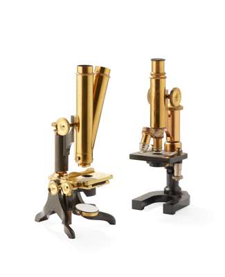 lacquered brass, with maker's mark on the footed base, in fitted box, box, 32cm high, microscope 30cm high (closed); together with a LACQUERED BRASS MONOCULAR MICROSCOPE BY J. TROTTER, GLASGOW, maker's mark on the footed base, in fitted box, box 32.5cm high, microscope 29cm high (closed)