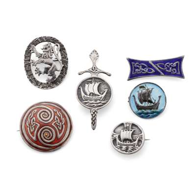 comprising a red enamel targe brooch; blue enamel bar brooch with Celtic knot work; a light blue enamel galleon brooch and three silver brooches