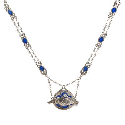 marked A.R. IONA, the central pendant modelled as a dove in flight, within a blue enamel ground, the chain composed of Celtic motif links each set with a blue enamel lozenge link
