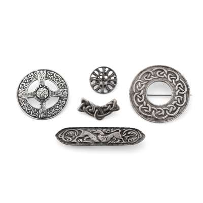 comprising a large Celtic knotwork annular brooch; a prioress brooch; and three Celtic brooches
