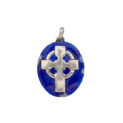 marked A.R. IONA, of oval outline, the slightly raised Celtic standing cross in a blue enamel border; together with another pendant cross, Robert Chandler, Birmingham 1907