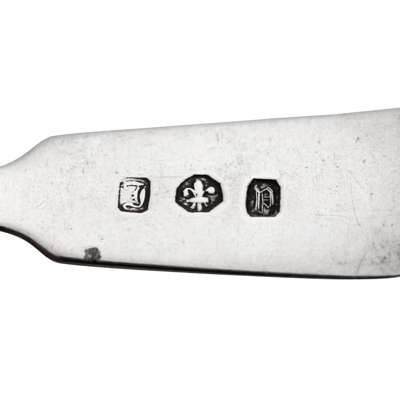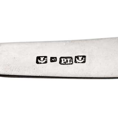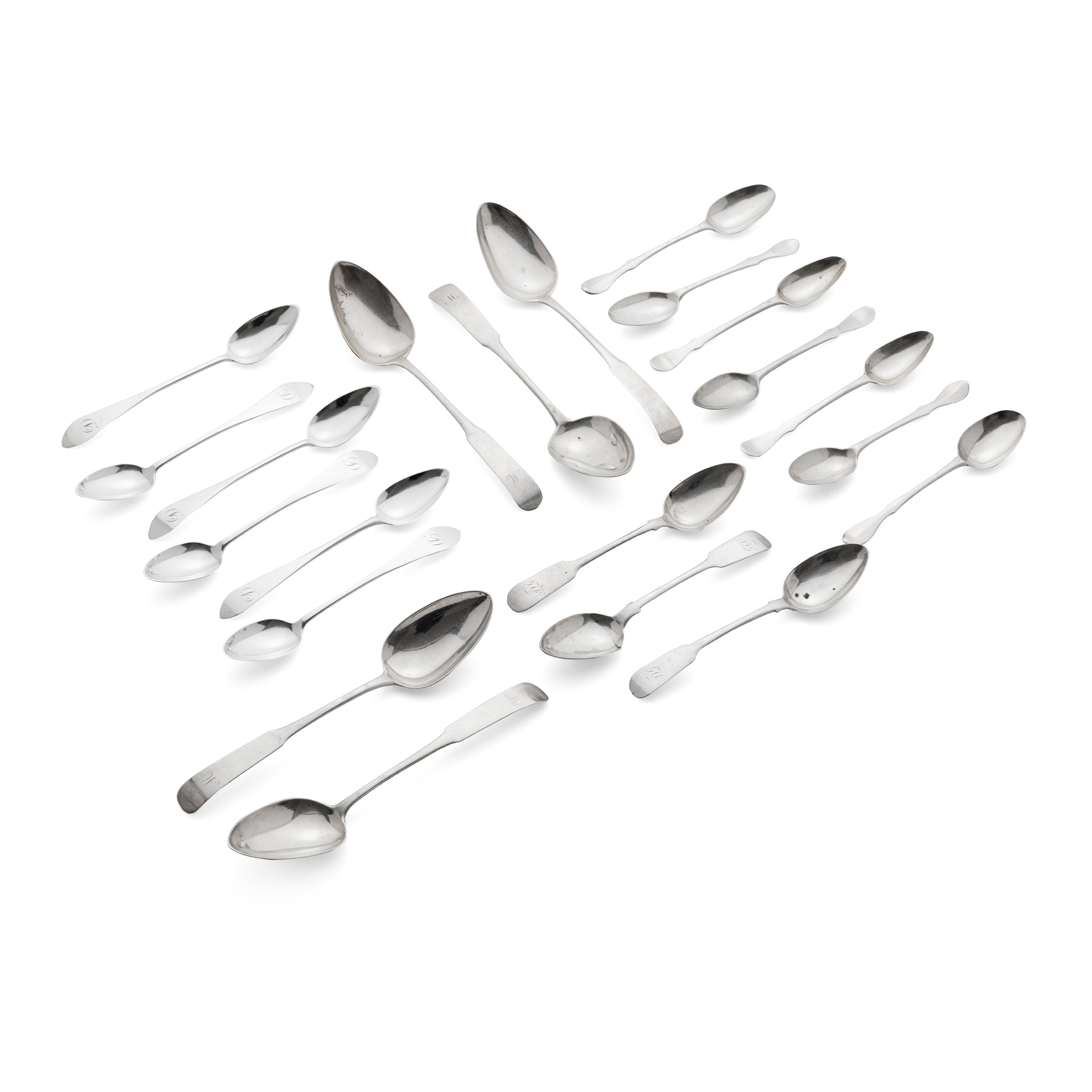 marked thistle, M, PL, thistle, of Oar pattern with script initial M to terminal; together with three Scottish Fiddle pattern teaspoons by Benjamin Lumsden of Montrose; four by Alex Zeigler of Edinburgh and small group of teaspoons to include Dundee, Paisley and unattributed