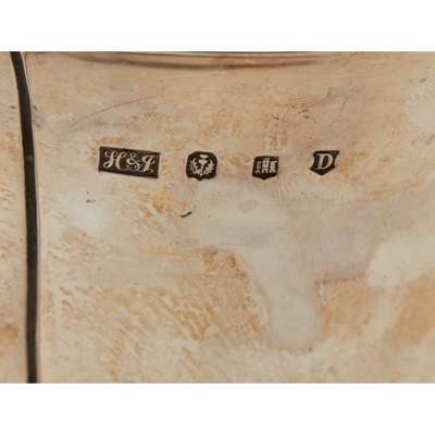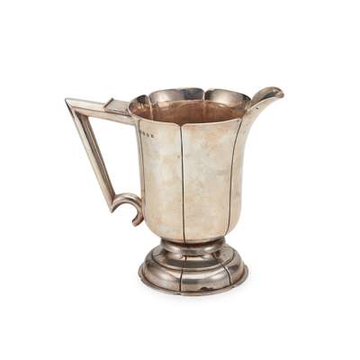 of lobed form, in the Commonwealth style, with slightly everted rim and spout, angular handle to a domed foot