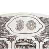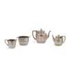 comprising a teapot, a twin handled sugar basin, and a milk jug, all of slightly tapered form with a central band of embossed depictions of zodiac signs, chased foliate borders throughout; together with another similar smaller teapot stamped A&T