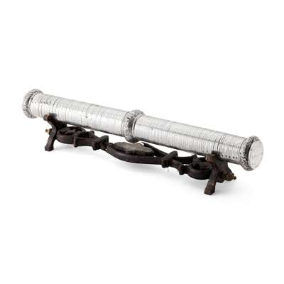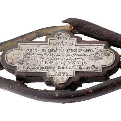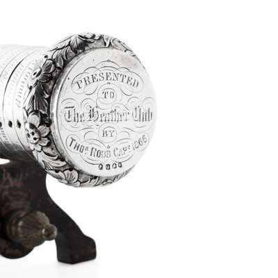 of cylindrical form, applied with individual bands each engraved with details of each annual meeting and Captain, with embossed floral decorated terminals and central waist, presented in a fitted mahogany box; together with a stand of scroll form, the central plaque with engraved inscription 'THIS STAND IS PART OF THE GREAT PLANE TREE AT KIPPENROSS...1871' with knopped finials to either end