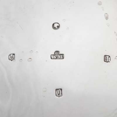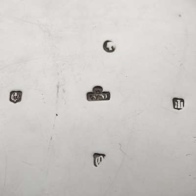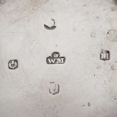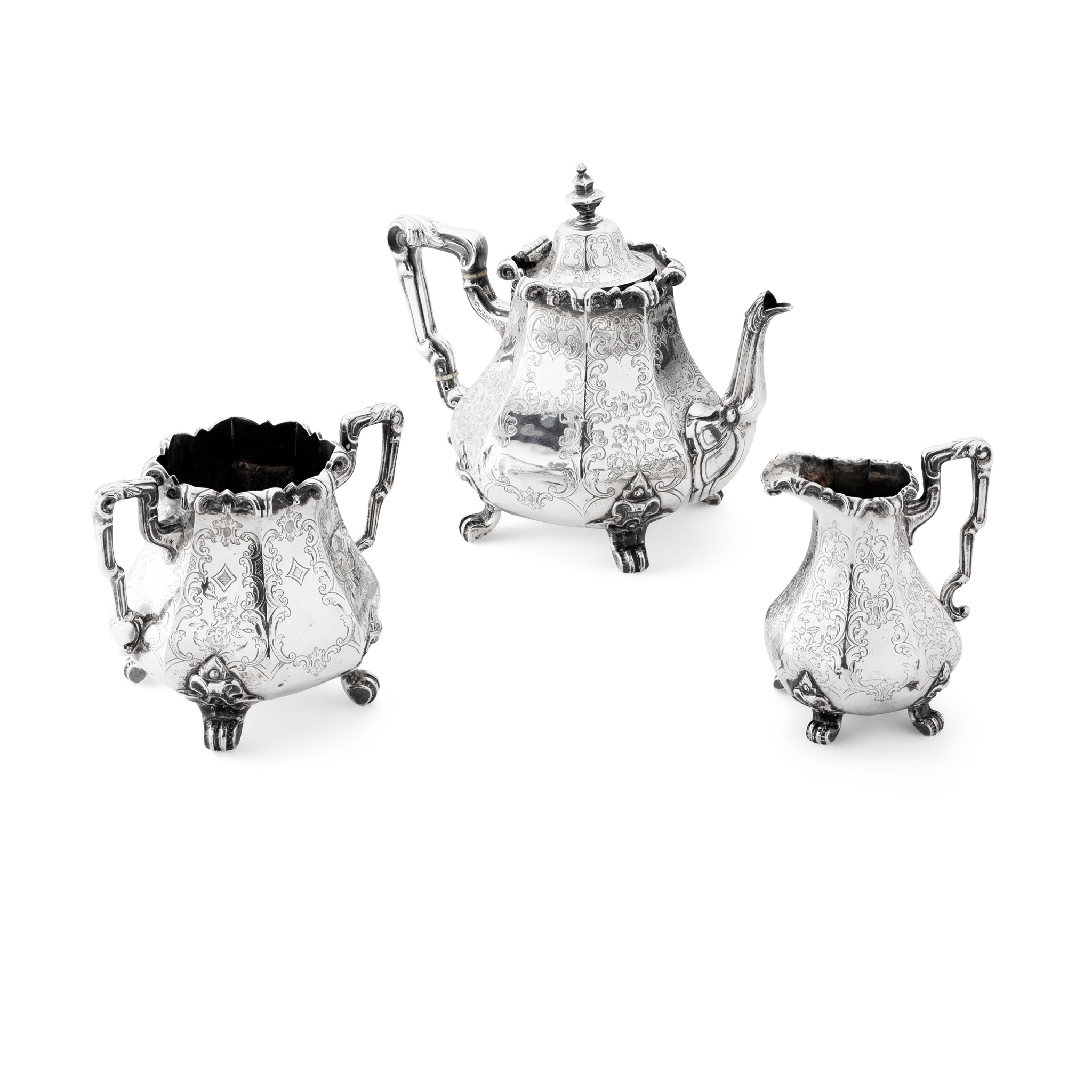 comprising teapot, twin handled sugar bowl and milk jug, of panelled octagonal form with engraved scroll and floral decoration, angular reeded handle and raised on bracket feet