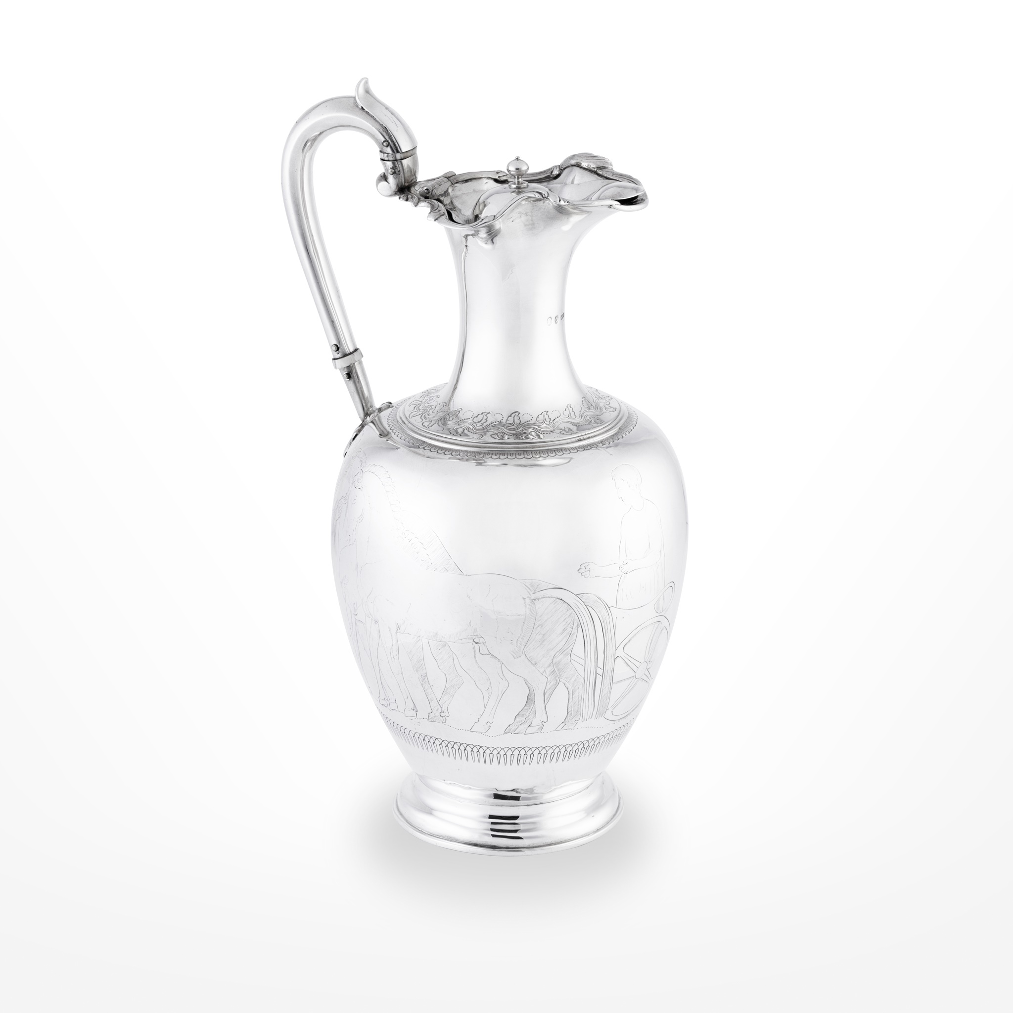 of slender baluster form, engraved Classical depiction to body of boys and horses, the neck with engraved floral border and scalloped rim, the handle of C scroll form with ivory inserts, raised on a circular foot