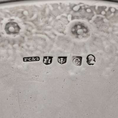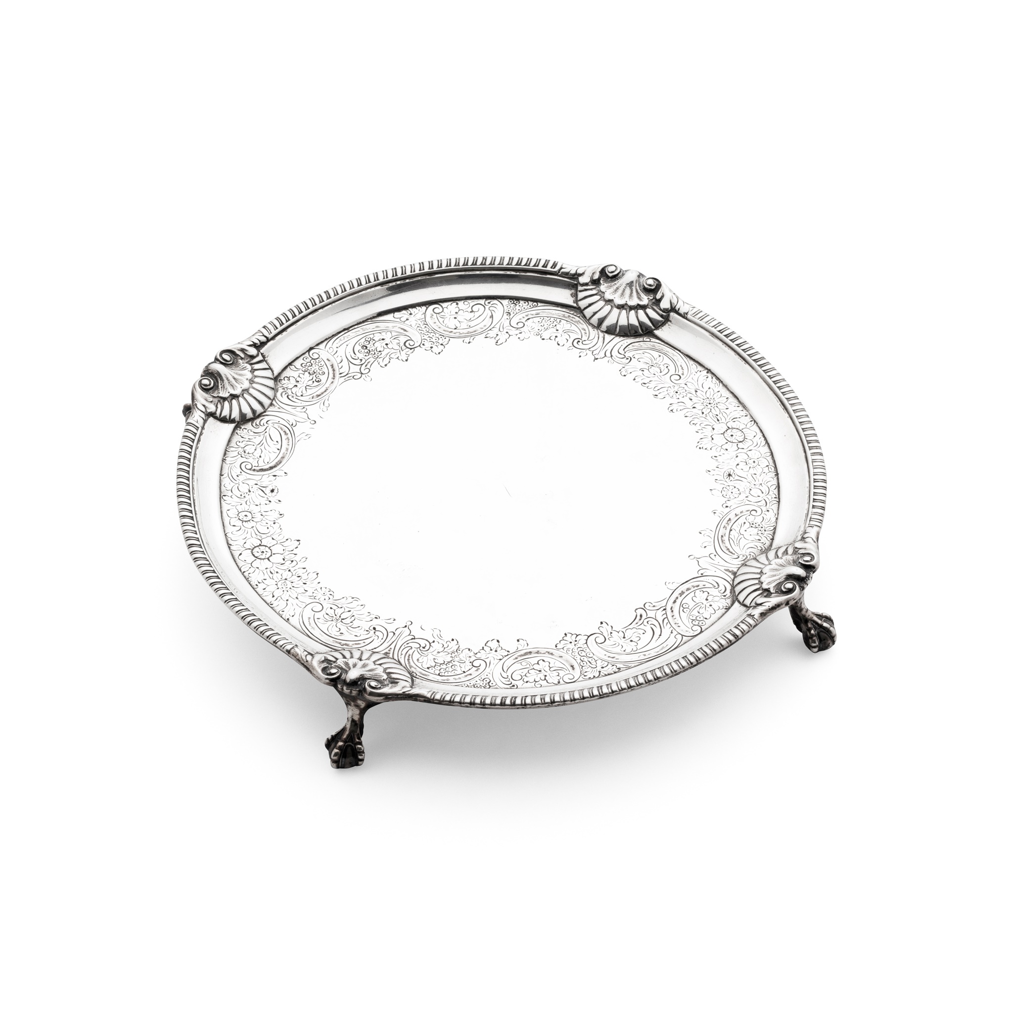 of shaped circular outline with gadrooned rim with large shell sections where claw and ball feet attached, the inner border of chased border of grapes and Rococo scrolls