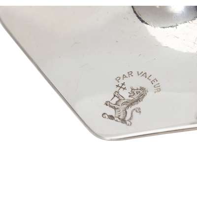 makers mark only, the flat hexagonal bases with simple ring handle with moulded thumbpiece, the domed centre set with cast socket sconce with moulded rim and girdle, engraved to base with crest and motto