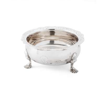 Assay Master Hugh Gordon, of circular form lobed rim, chased flowerhead border, raised on hoof and shell feet