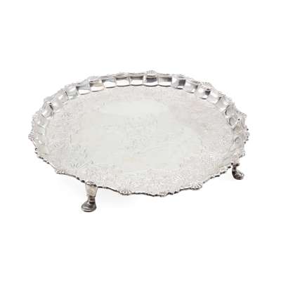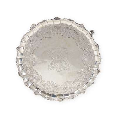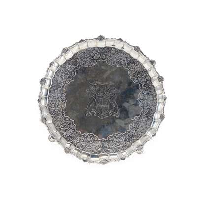 Assay Master Hugh Gordon, of shaped circular outline with scroll and shell cast border, the flat with a broad chased border of fruits and flowers within foliate, scroll and shell border, the centre with engraved coat of arms, raised on four scroll and hoof feet
