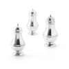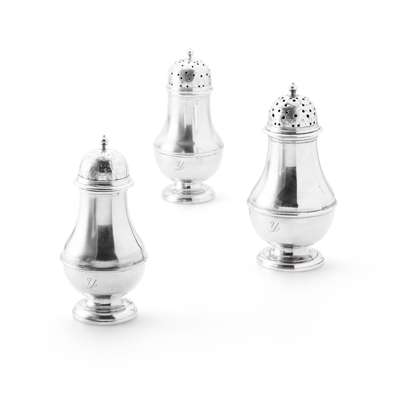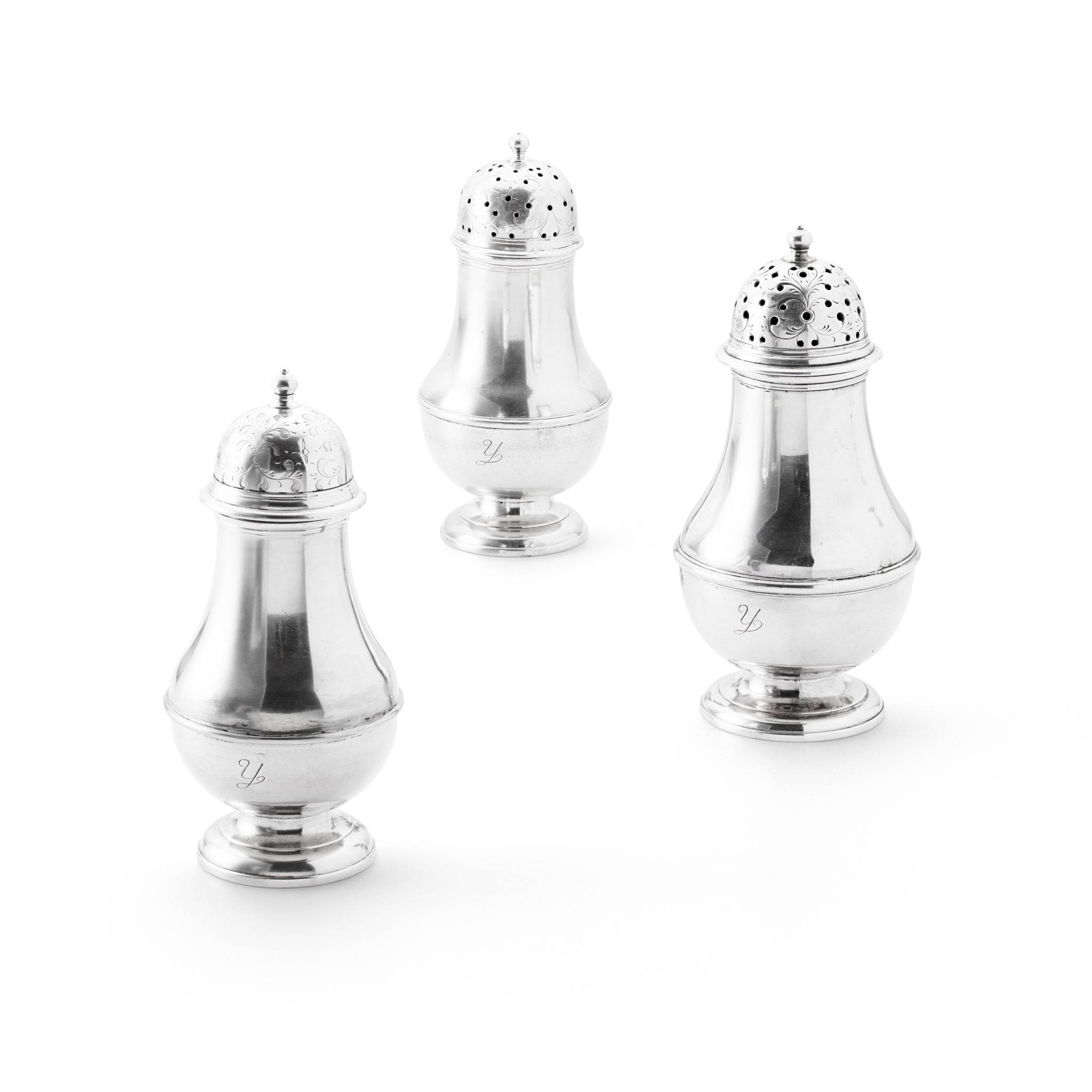 of squat baluster form, two with pierced pull off lids, one blind, engraved scroll detail with ball finials, all with italic y engraved to lower body