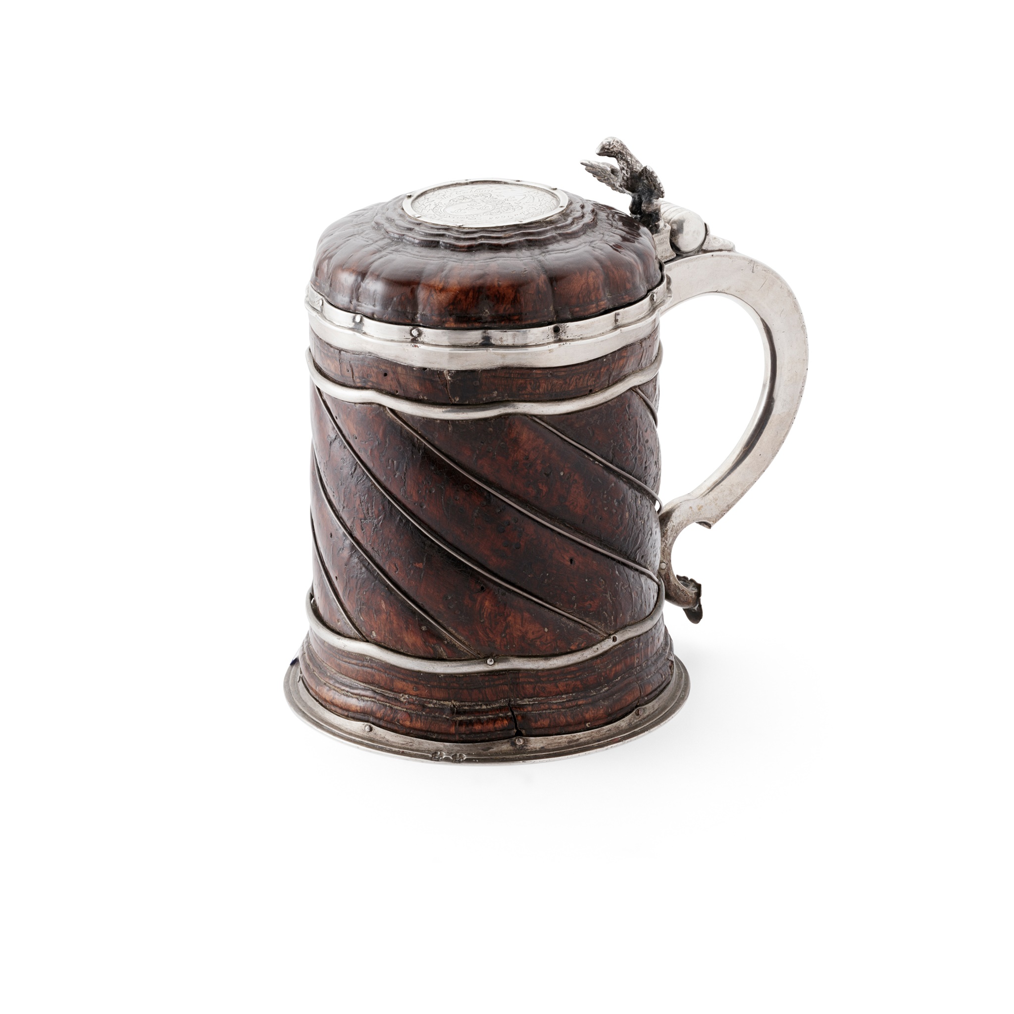 likely Dutch with makers mark M struck twice, the straight-sided burr wood body with twin wavy applied girdles with spiralled wire mounts between, the foot rim with a wide flanged foot, the hinged burr wood cover carved to fit the scalloped rim, centrally set with a finely engraved armorial plaque dated 1688, the silver handle with eagle thumbpiece