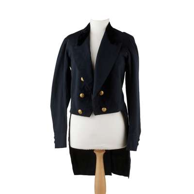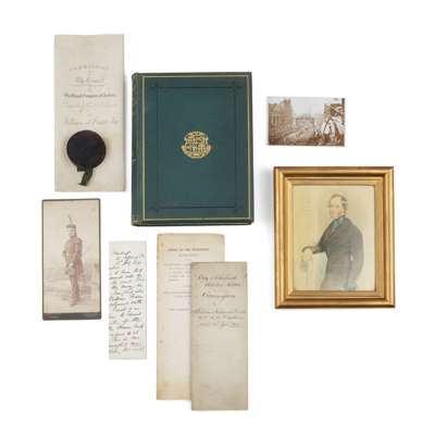 comprising his cross hilted small sword with cast brass hilt of Roman type with double edged etched spear point blade with VR cypher central fuller and original brass mounted leather scabbard; his green dress jacket with gilt buttons, Commission by the Council of the RCA, City of Edinburgh Artillery Militia Commission, Carte de Vista of Fraser in full uniform, a small watercolour of Willian N Fraser, The History of the Royal Company of Archer by James Balfour, with additional 1886 report
